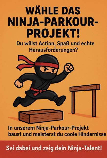 Du willst Action, Spaß und echte Herausforderungen? In unserem Ninja-Parkour-Projekt baust und meisterst du coole Hindernisse, trainierst Geschick und Schnelligkeit und wirst selbst zum Ninja. Gemeinsam schaffen wir einen spannenden Final-Parcours – für alle, die Abenteuer lieben!